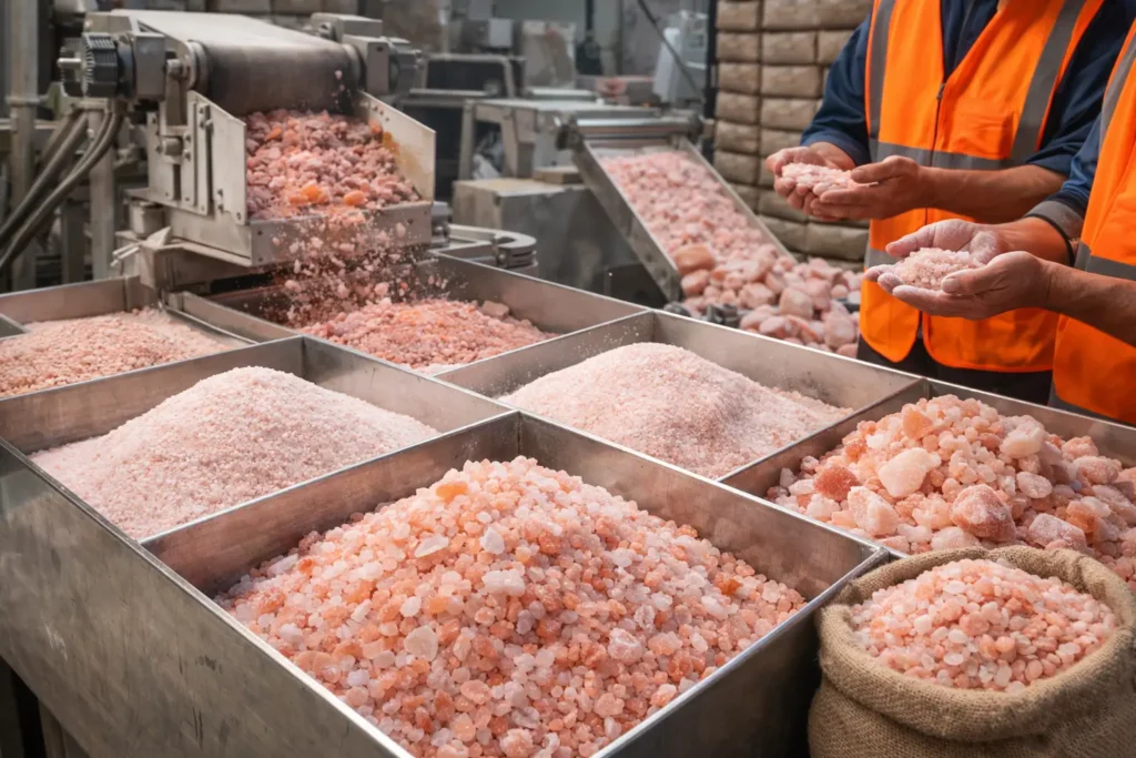 After cleaning, the salt is sorted, crushed, and graded using modern machinery in a controlled environment. We classify the salt according to particle size and intended use — whether for edible, decorative, wellness, or industrial applications. Each batch undergoes manual and visual inspection to guarantee consistent quality and natural brilliance.